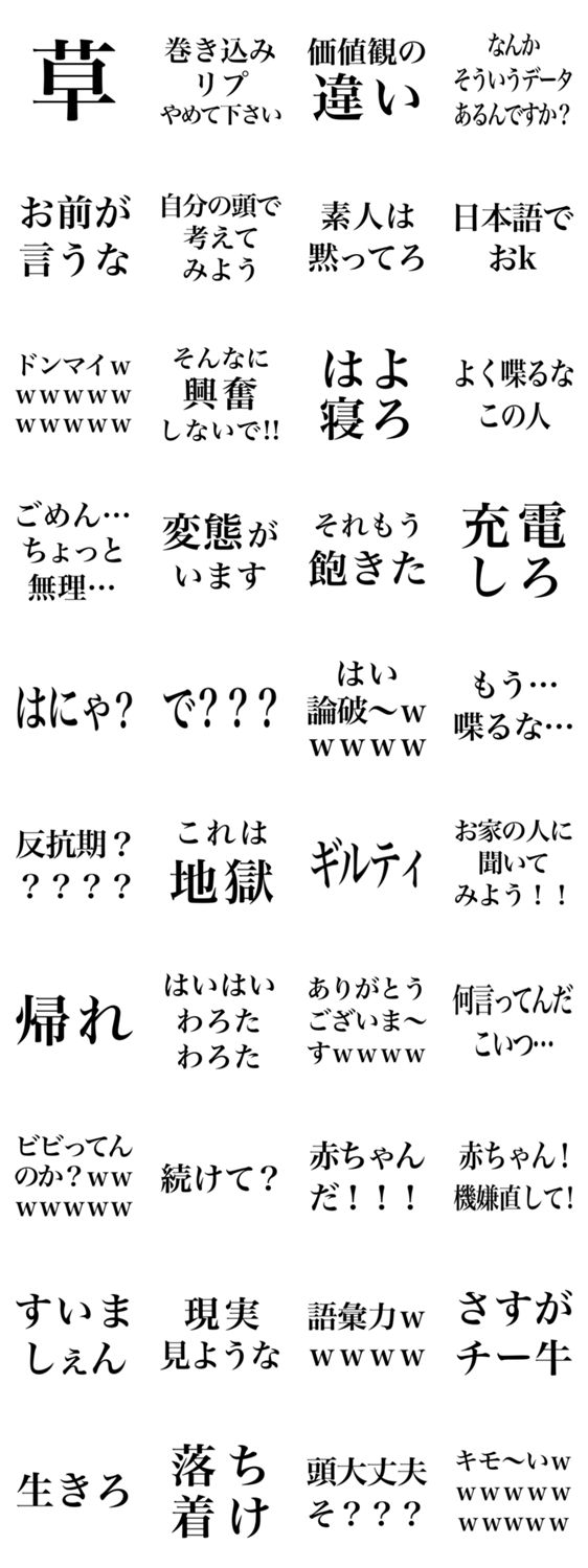 シンプルに人を煽るスタンプです。煽り煽られましょう。デカ文字/でか文字/ネタ系/シュール/面白い系/変なスタンプ/キモいスタンプ/悪口/チー牛/毒舌/oroninet