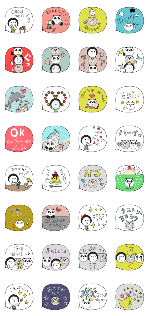 スタンプ説明文 おはよう/おやすみ/ありがとう/おつかれ/よろしく/了解/など毎日よく使うスタンプの詰め合わせです。パンダ、くま、レト子、ねこなど盛りだくさん♡