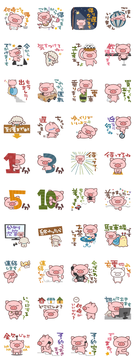 ぶたたが連絡や報告のお手伝いをします。「到着まであと」→「3分」、「終わったら」→「連絡します」などつなげて使うスタンプも。ぶたたシリーズ第11弾。