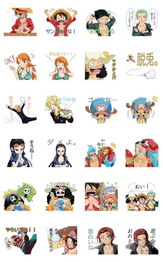 ONE PIECEのキャラクター達のスタンプです。比較的普段使いしやすいシチュエーションを選びました。