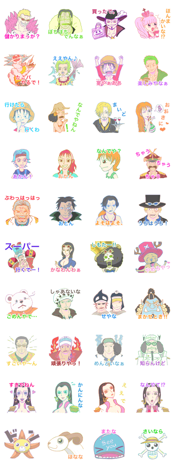 カラフルポップなONE PIECEキャラクターたちの関西弁スタンプです。(麦わらの一味・七武海・海軍・魚人・ハートの海賊団・革命軍など)