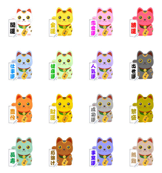 日本のラッキーアイテムのネコです。色によってご利益が変わります。恋愛、金運、合格祈願、健康など。 現在この商品は一部のスマートフォン版LINE 10.3.0以上のトークルームでのみ使用できます。動作環境の最新情報はヘルプをご確認ください。