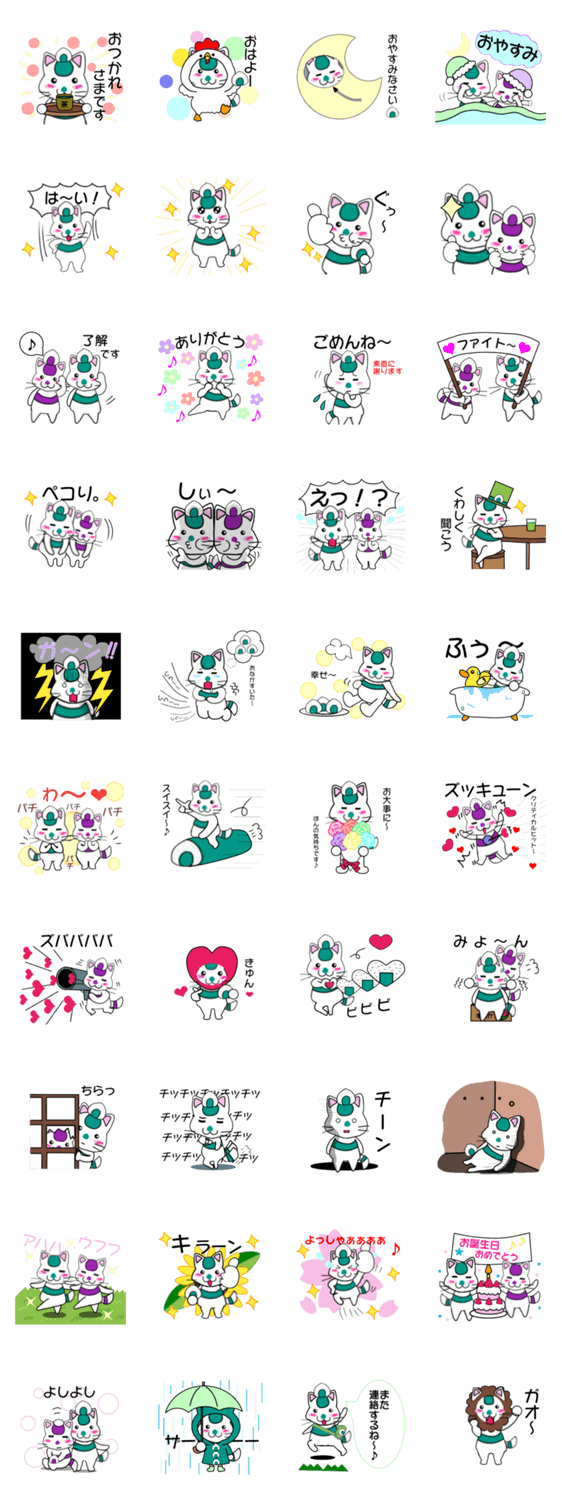 ネオ丸の日常スタンプその5です。緑のかわいいニャンコの笑顔に癒されて下さいね。おにぎり持った猫。緑の猫。癒し系猫。おもしろキュート猫。