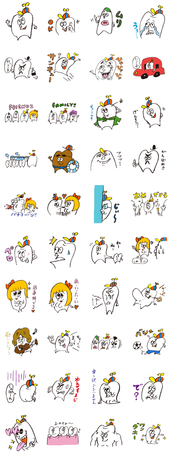 クレイアニメ『前歯の前ちゃん』がスタンプになったよ!前ちゃんのともだちの犬歯のケンシロウ、八重歯のヤエ子、親知らずのオヤシラズもよろしく!みんなも歯を大切に!