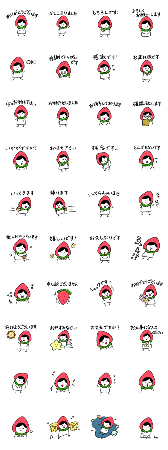 ゆるゆるいちごずきんの敬語タイプのスタンプです。仕事での連絡から家族まで幅広く使えます!
