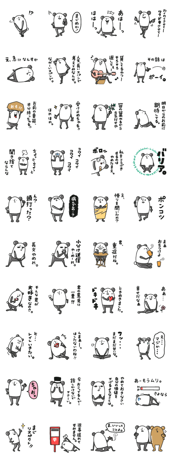面白い表情で時につっこみ、相手を煽り、からかうときもあれば言いにくいことを代弁したり、楽しませることも励ますこともある、シュールなパンダのスタンプです。