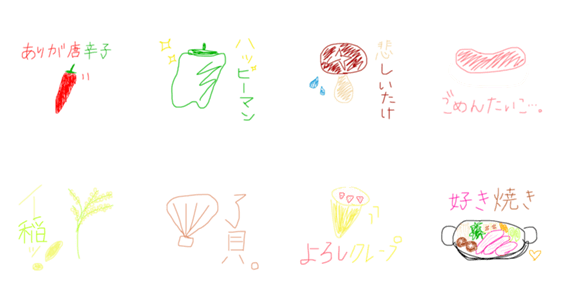その名の通り「絵心を少し奪われた食べ物たち」のLINEスタンプです。割と使いやすい言葉たちを集めてみました。いかがでしょうか。