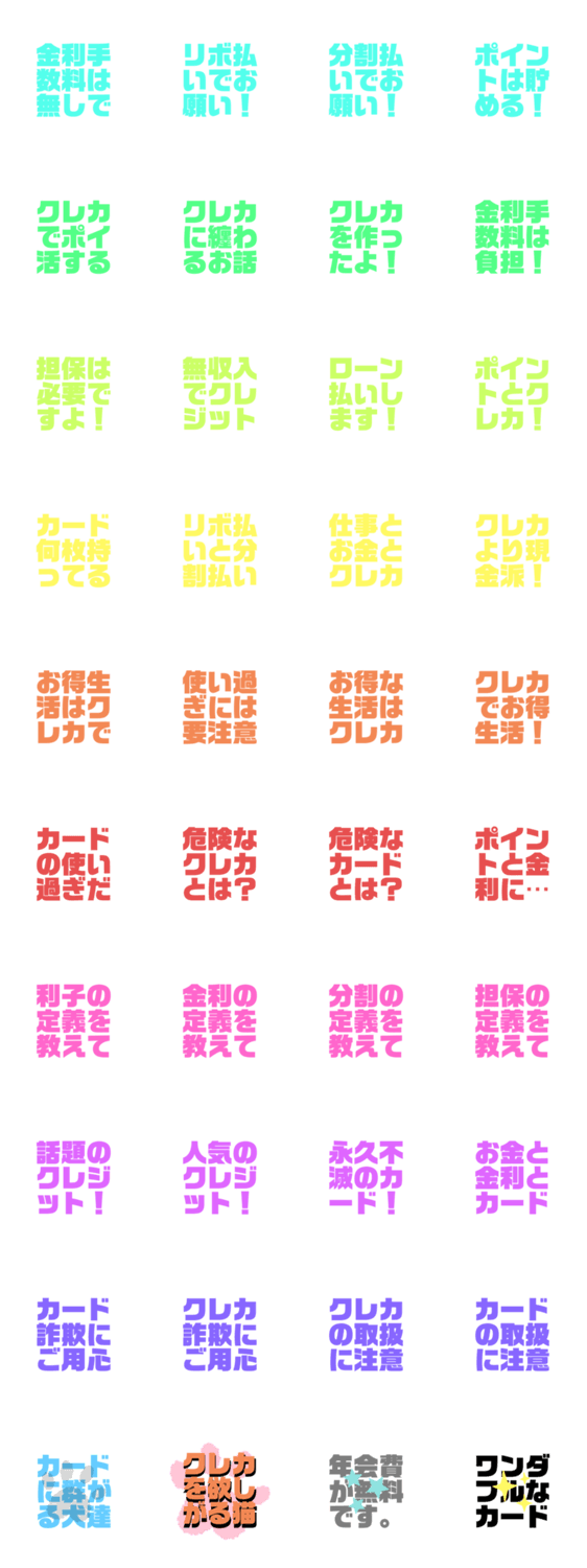 クレジットカードに関することを9文字にしたLINEスタンプです。利子・分割払い・リボ払い・担保・クレカ・ポイント等の言葉を使用しました。