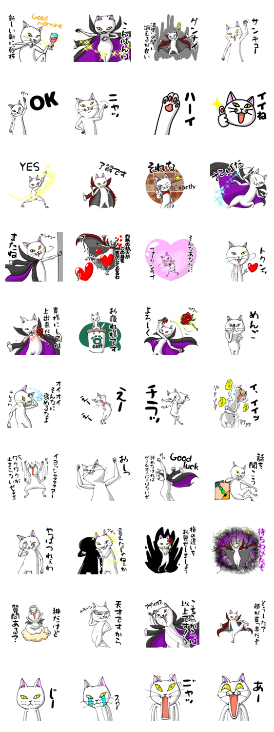 厨二病風ねこの毎日使えるフレーズ。 シンプルではないですが比較的使いやすい言葉を厨二っぽく、執事っぽいキザな白いネコのスタンプ。一見かわいい面白い敬語ヤンキー