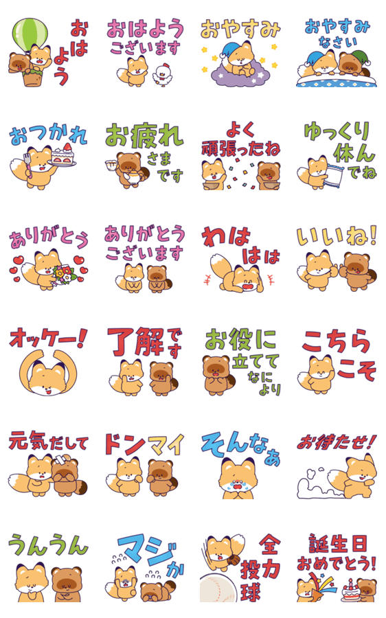 大きな文字で見やすい!男女問わず使いやすい、毎日の挨拶やお返事に便利なキツネとタヌキの飛び出すスタンプです♪