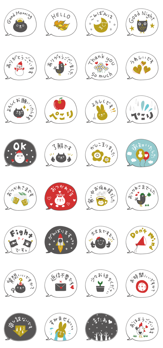 よく使うベーシックセットです。おはよう/おやすみ/ありがとう/よろしく/おつかれさま/了解など。