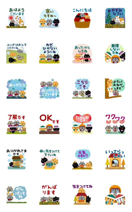 ちびねこイッパイの飛び出すスタンプ、冬バージョンです。 日常会話に使いやすい言葉いろいろ、敬語も入っています。