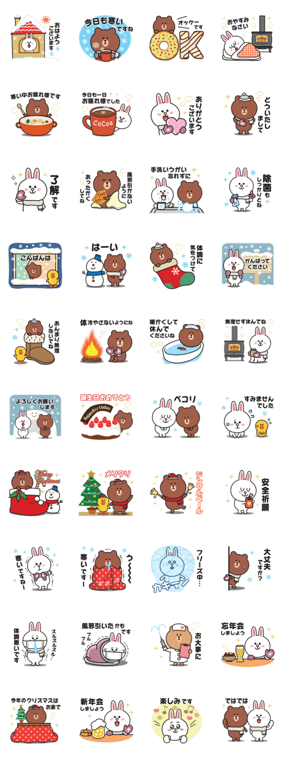 BROWN & FRIENDSの冬の日常でよく使う言葉を集めたとっても使えるスタンプです。挨拶や敬語、丁寧語があるので、家族や友達にも使えます。 ※BROWN & FRIENDS をみんなでつくろう!キャンペーン参加スタンプです