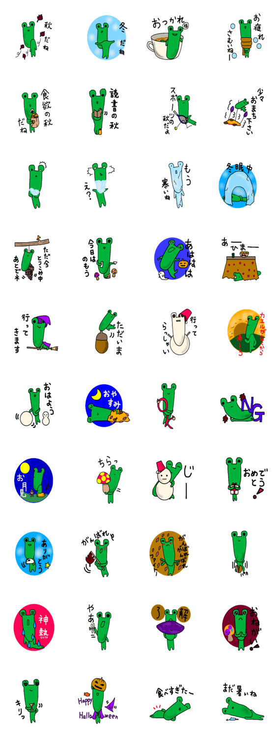 顎のながーい蛙くんの第3弾です。秋から冬にかけてのスタンプになります。今回もながーいです♪