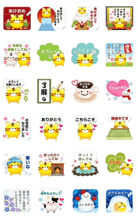 | スタンプ説明 | 2022年(令和4年)干支の寅(トラ・とら)のスタンプで新年のご挨拶を!喪中/年末/年始/日常/敬語/寅年/お正月/富士山/年賀/大晦日/雪だるま/寒い/冬/カワイイ/可愛い/迎春/季節 現在この商品は一部のスマートフォン版LINE 10.3.0以上のトークルームでのみ使用できます。動作環境の最新情報はヘルプをご確認ください。 |