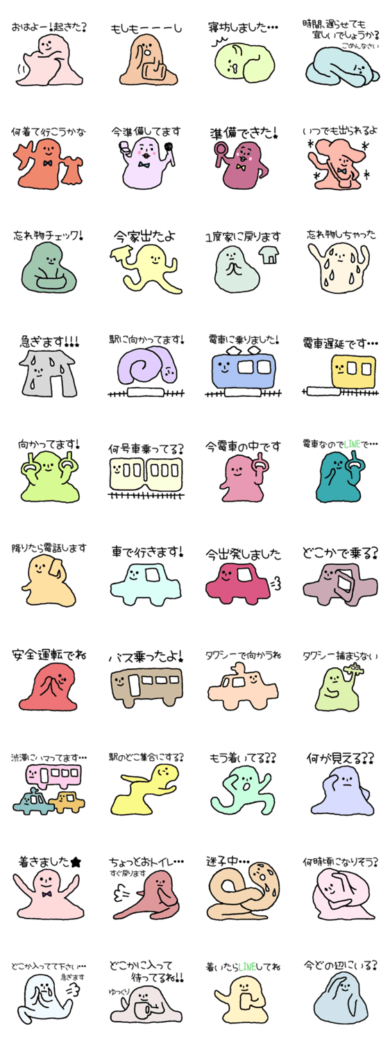 変幻自在。くねくね。集合場所までに使いやすい言葉を取り揃えました。すぐに伝えたい事、遅れそうな時、南口?東口?逢えない時…。あるとイイナがある便利なスタンプ。