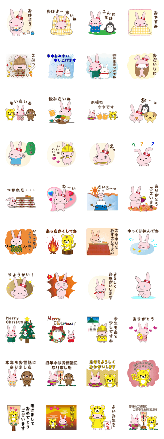 可愛いうさぎ、ハピーの冬のスタンプです。 寒い冬やクリスマス、年末年始に使えるスタンプです。