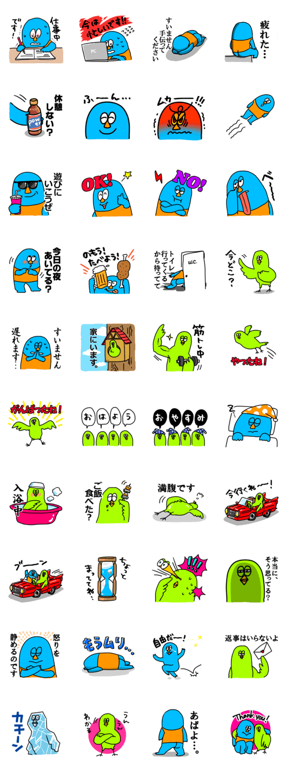毎日を頑張って生きている不思議な生き物ブルーオと黄緑色の鳥キミドリのスタンプです。