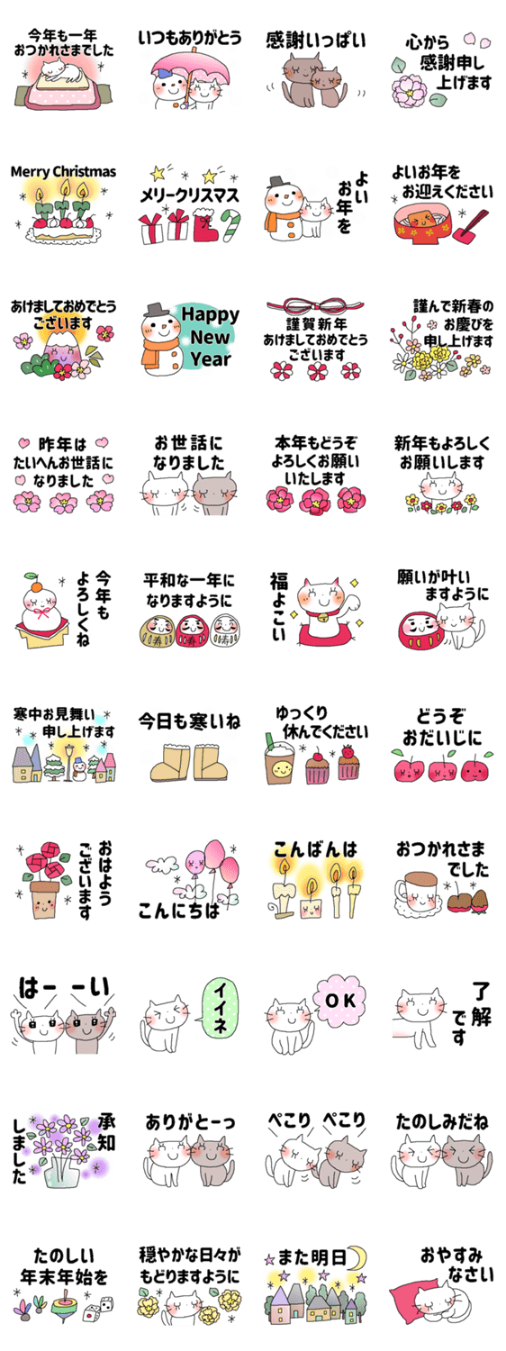 日頃の感謝を込めて贈ります。シンプルで見やすい大きな文字、敬語多めで使いやすい大人かわいい40個。ずっと使える冬のご挨拶(年賀状)スタンプです。