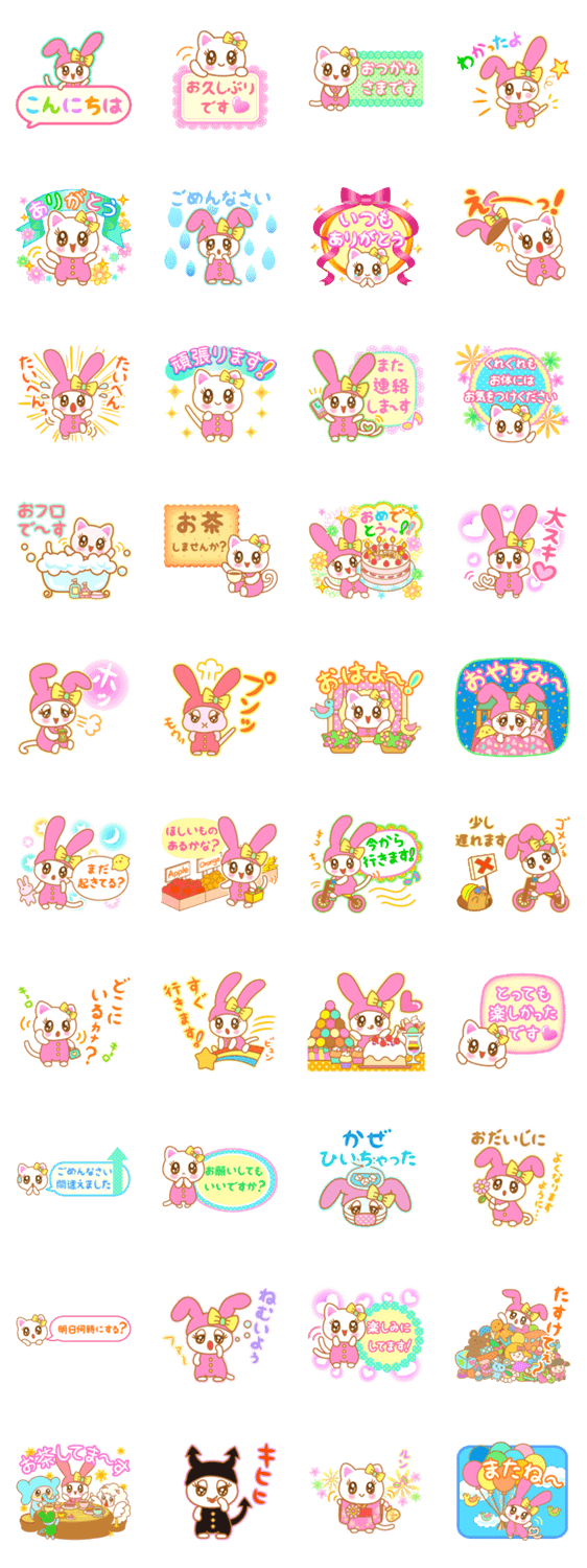 ウサギの帽子をかぶったネコの、とっても楽しいにぎやかスタンプです。