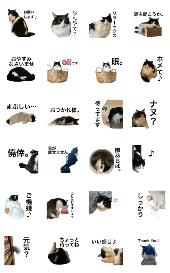 LINEスタンプメーカーでつくりました。作者の愛猫、長毛ハチワレ猫『るるさん』のスタンプです。