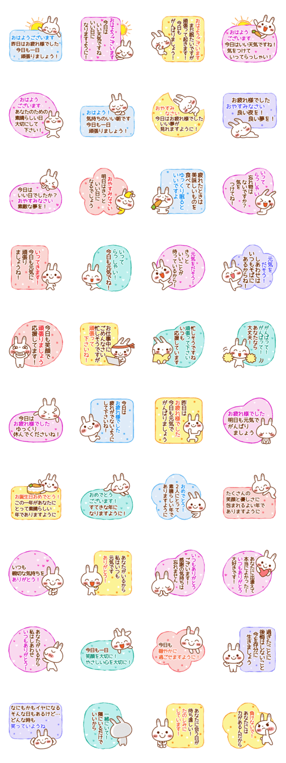 文章で伝えにくい応援、いたわり、感謝、お祝いなどの元気がでるメッセージを「プチッ」と送れるスタンプです。プリンのブチうさぎシリーズ第5弾。