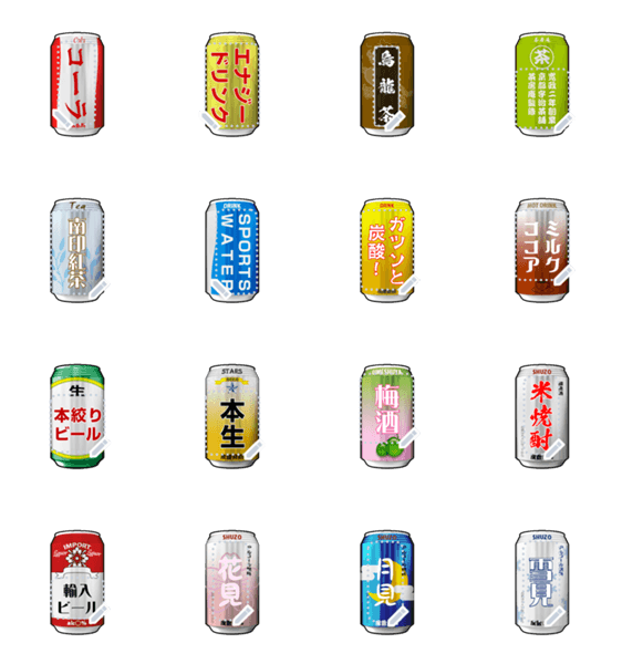 ジュース、緑茶、コーラなどのソフトドリンクから、ビールや梅酒などのお酒まで、缶をアレンジしました。商品名を書き込めます。 現在この商品は一部のスマートフォン版LINE 10.3.0以上のトークルームでのみ使用できます。動作環境の最新情報はヘルプをご確認ください。