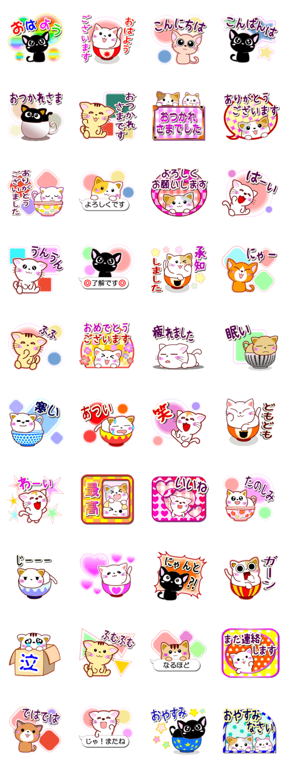 かわいい癒しの子猫たち、おはようからおやすみ、お疲れ様、ありがとう、感謝喜怒哀楽、よく使う日常会話で毎日使えるいろんなネコをミックスしたスタンプ集です