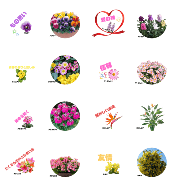 花と花言葉のスタンプ。花を買って贈るのは大変だけど、花言葉に花のスタンプを添えて送ってみては。