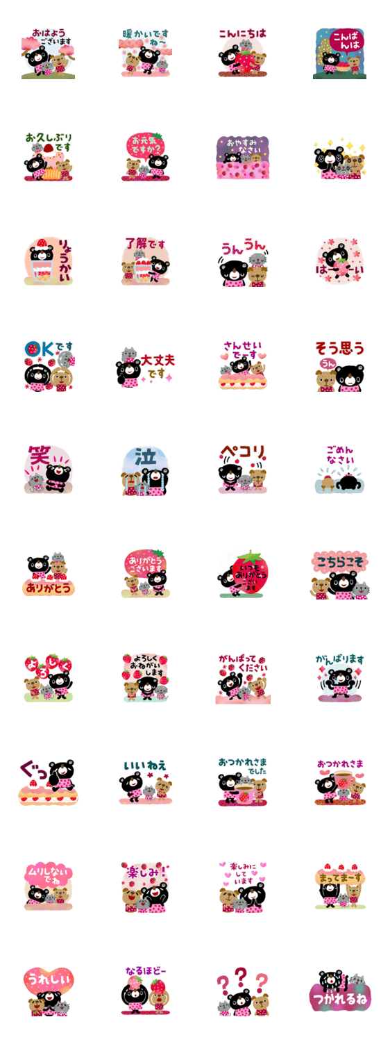 ちびくま・ちびいぬ・ちびねこの苺だらけのスタンプです♡ 日常会話に使いやすい言葉いろいろ、敬語もイッパイです。