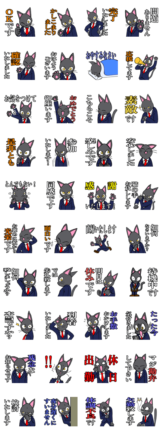 目元がキリッとしたスーツ黒猫のスタンプ第二弾です。社会人向け敬語です。