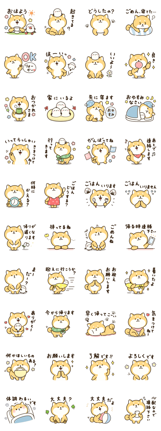 ぽっちゃりした豆しばの家族連絡用スタンプです。家族・友人・カップルとの日常会話や挨拶・連絡用に使えるスタンプセットです。友達はシマエナガさんです。