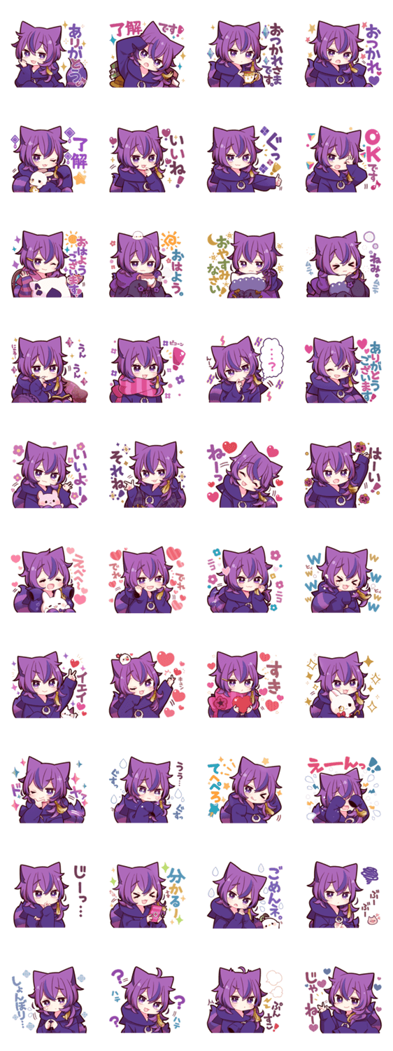 チェシャ猫の男の子のスタンプです。毎日使える挨拶やリアクションが沢山入っています。