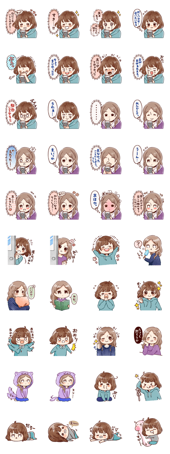 素直に気持ちを表す明るい女の子と、ツンデレなジト目の女の子。『本当に』すき。『本当は』すき。そんな2人の心の声をスタンプにしました。下半分は普段使いにどうぞ。