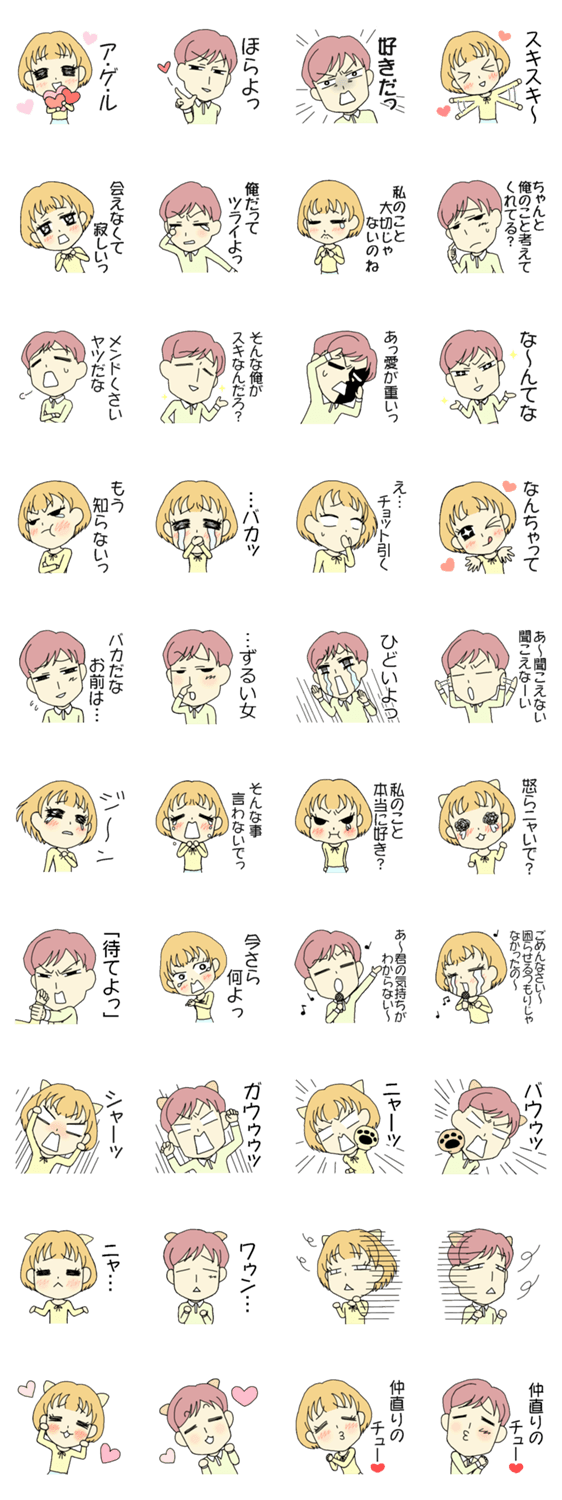バカップルがこじれてしまった時に使えるスタンプ。恋人と愛を確かめ合いたい時、仲直りしたい時、犬or猫になりたい時に是非どうぞ☆