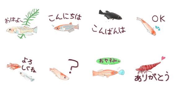 メダカ好きな人が楽しんで使えるスタンプです!エビもいます