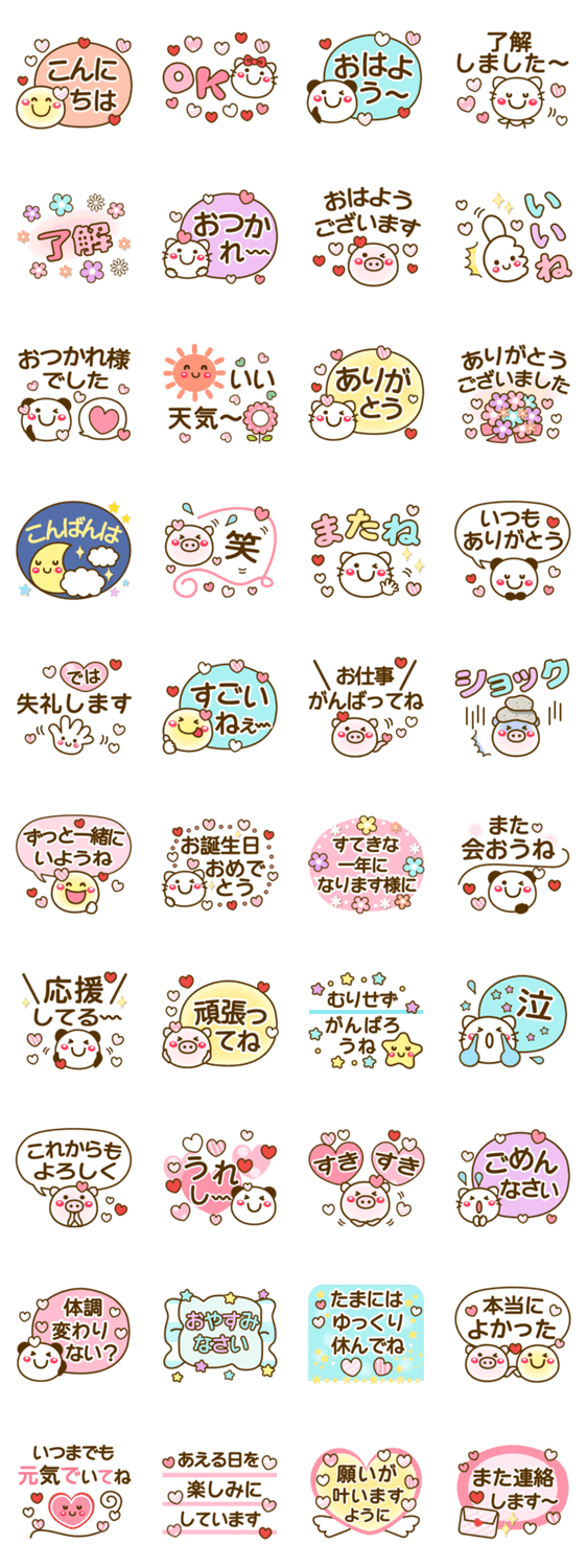 かわいい動物達10.1の【あいさつ いっぱい】スタンプです。タメ語 敬語両方入りで、デカ文字、いろんな人に送れて便利!です。パンダ ねこ ぶた❤作:usakazu1