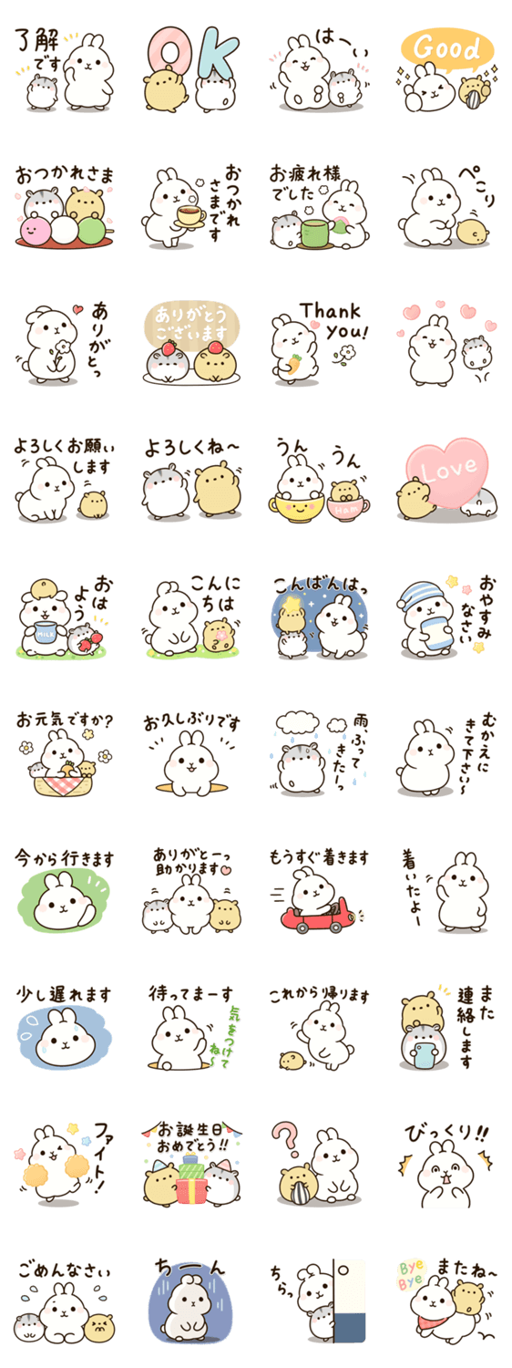 ぽっちゃりしたうさぎとハムスターのよく使う言葉や毎日使える挨拶スタンプです。