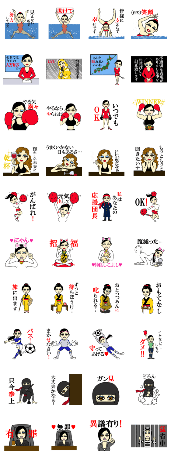 ボクサー、サッカーなどスポーツ選手からキャスター、くのいち、町娘、スナックのママなどなど、ちょっとセクシーだけど なかなか使えるスタンプです。