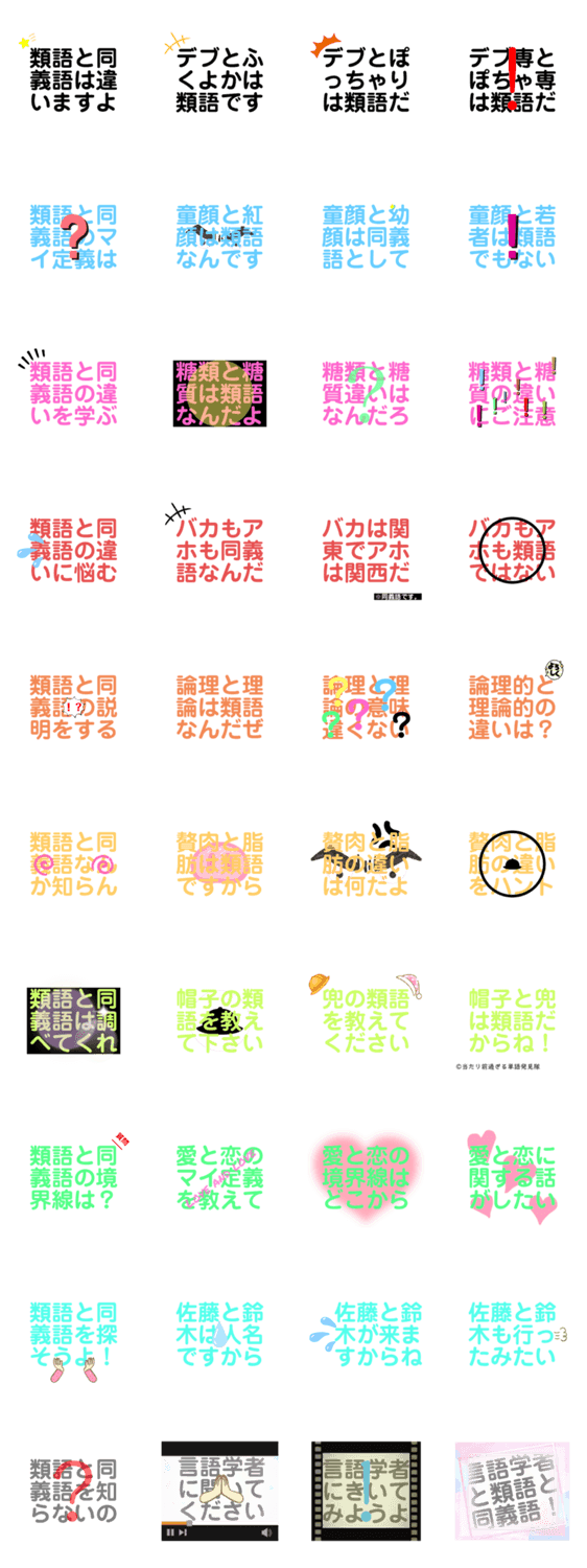 デブ・ふくよか・ぽっちゃり・童顔・紅顔・幼顔・糖類・糖質・バカ・アホ・論理・理論・贅肉・脂肪・帽子・兜・愛・恋等の類語や同義語を使った名言風のLINEスタンプです。