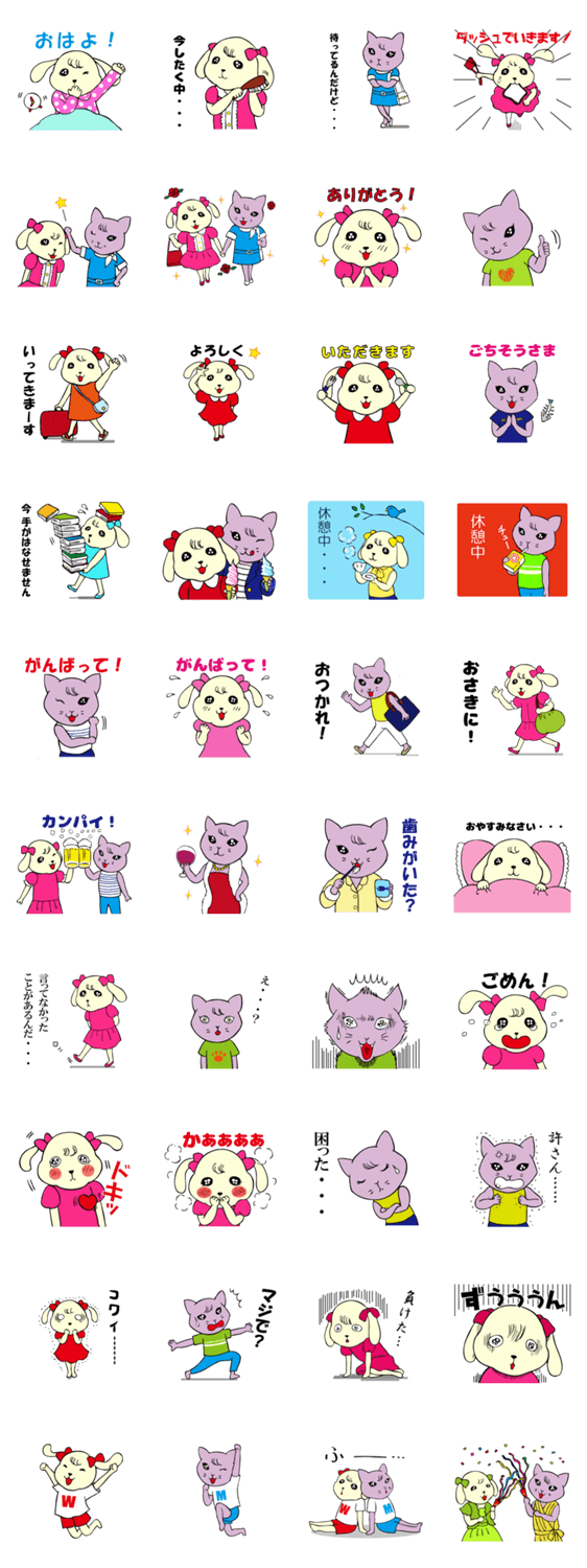 犬のワン子とねこのミー子 なかよしの二人の日常をスタンプにしました。友達同士のやりとりに使いやすいフレーズになっております。