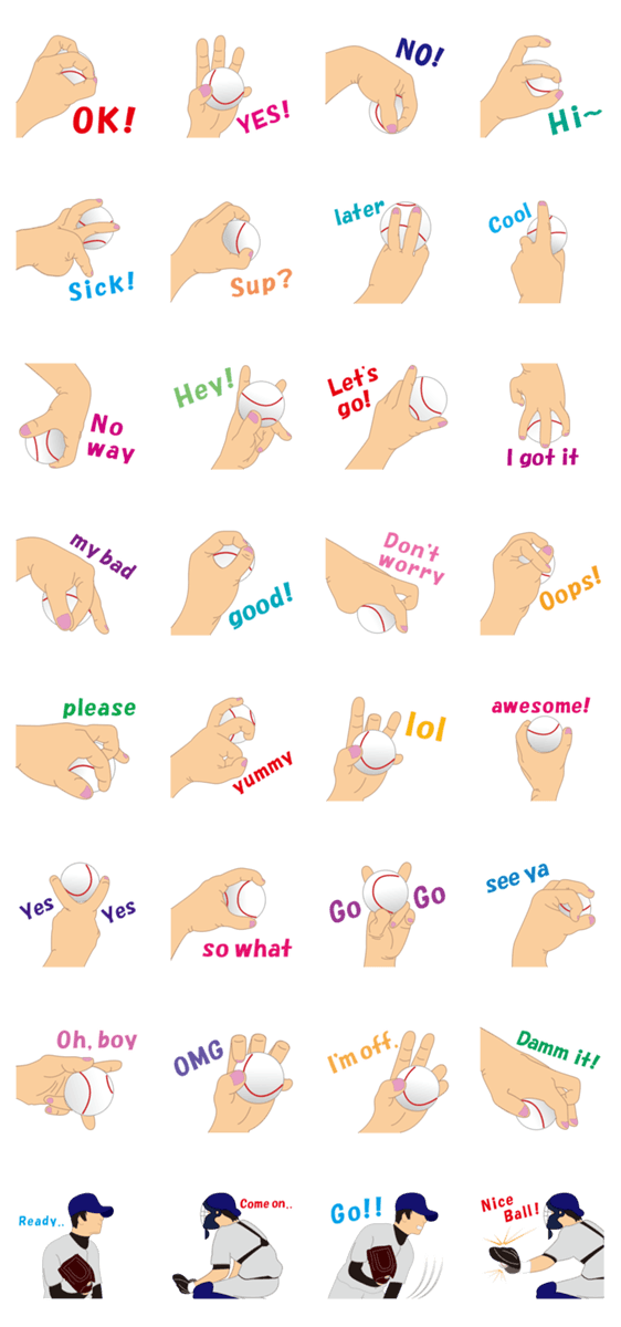 野球が大好きな方へ贈る!変化球の握りをモチーフに構成された超シュールな野球スタンプ!見たこともないオリジナル変化球もあり♪このスタンプで会話のキャッチボールを!