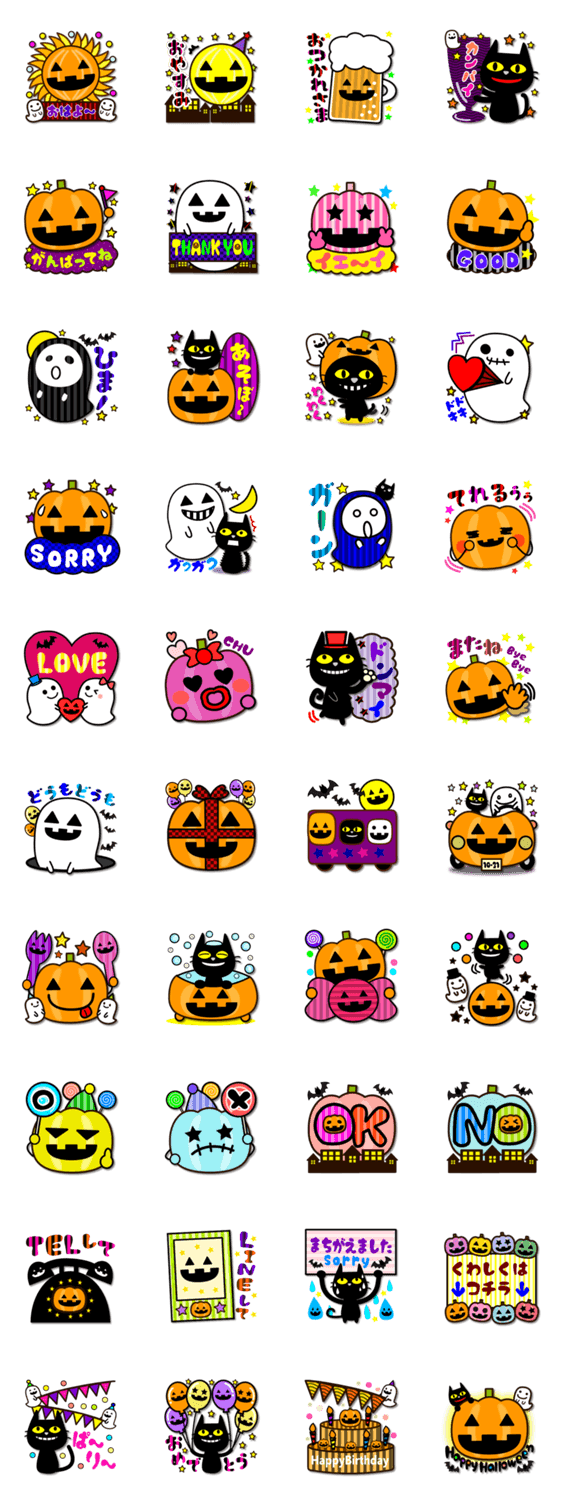 かぼちゃ、おばけ、黒ネコの愉快で使いやすいスタンプです。