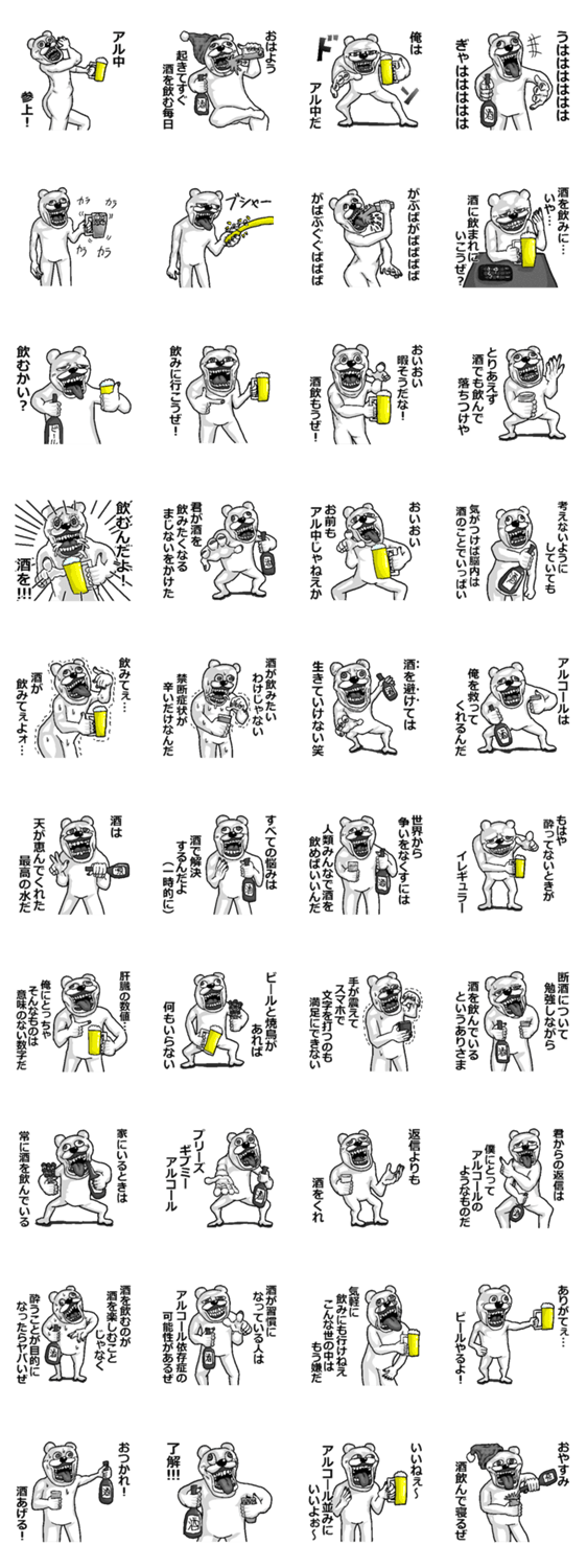 アル中のくまのスタンプです。アル中の方におすすめ。酒に飲まれよう。アルコール依存症、お酒、飲み会、クマ、熊、肝臓、ビール。ウザい、キモい面白い。アル中シリーズ。