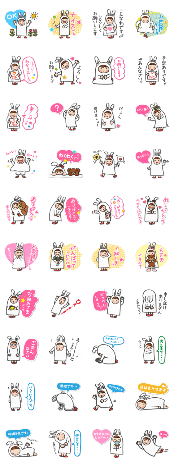ウサギの洋服を着た「ぴょん」が主人公で活躍するスタンプです。日常会話で役立つワードをたくさん作りました。ちょっと丁寧な言葉で想いが伝たわるといいな。