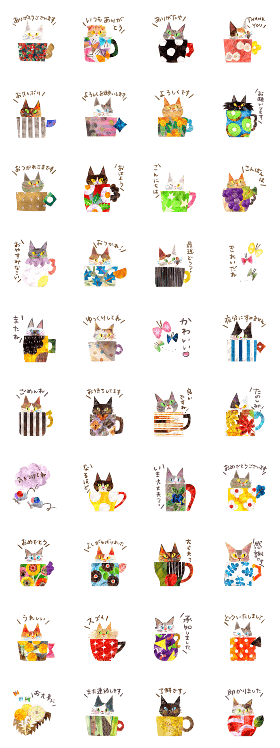 様々な柄のカップに入ったネコちゃんのスタンプで気分が明るくなること間違いなし!日常で使えるスタンプです。