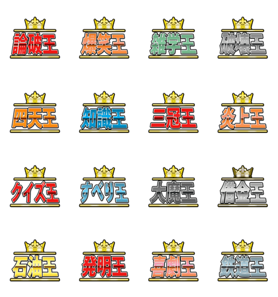 論破王、石油王、爆笑王、雑学王など、色々な分野の王を集めました。王冠が輝いています。