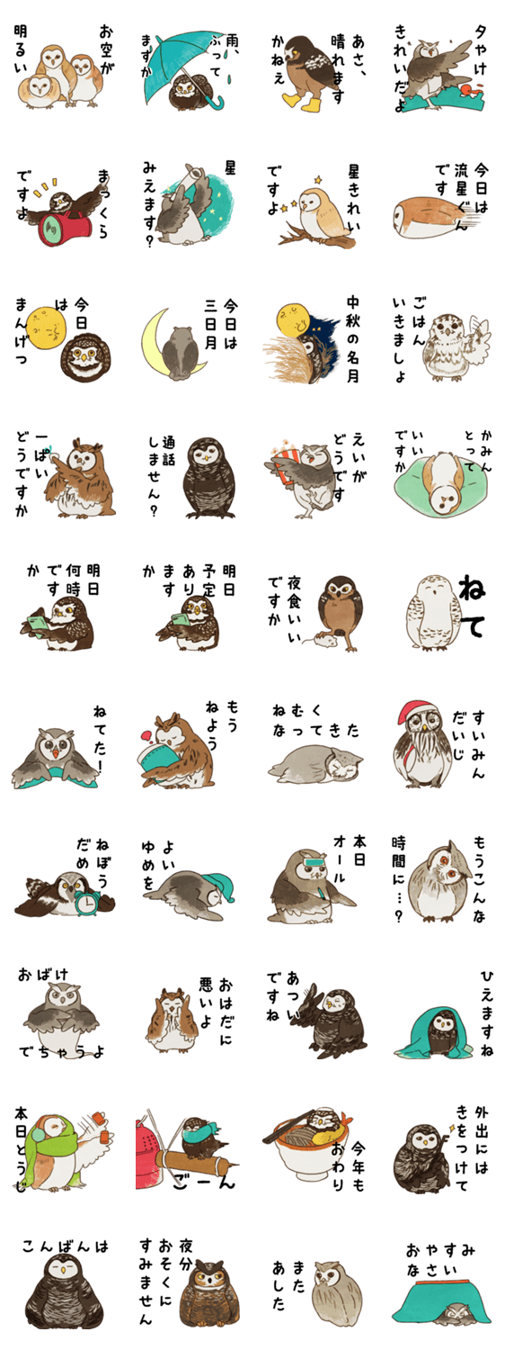 夜に使えるかわいいフクロウのスタンプです。お仕事を頑張るお友達に送って上げてくださいませ!