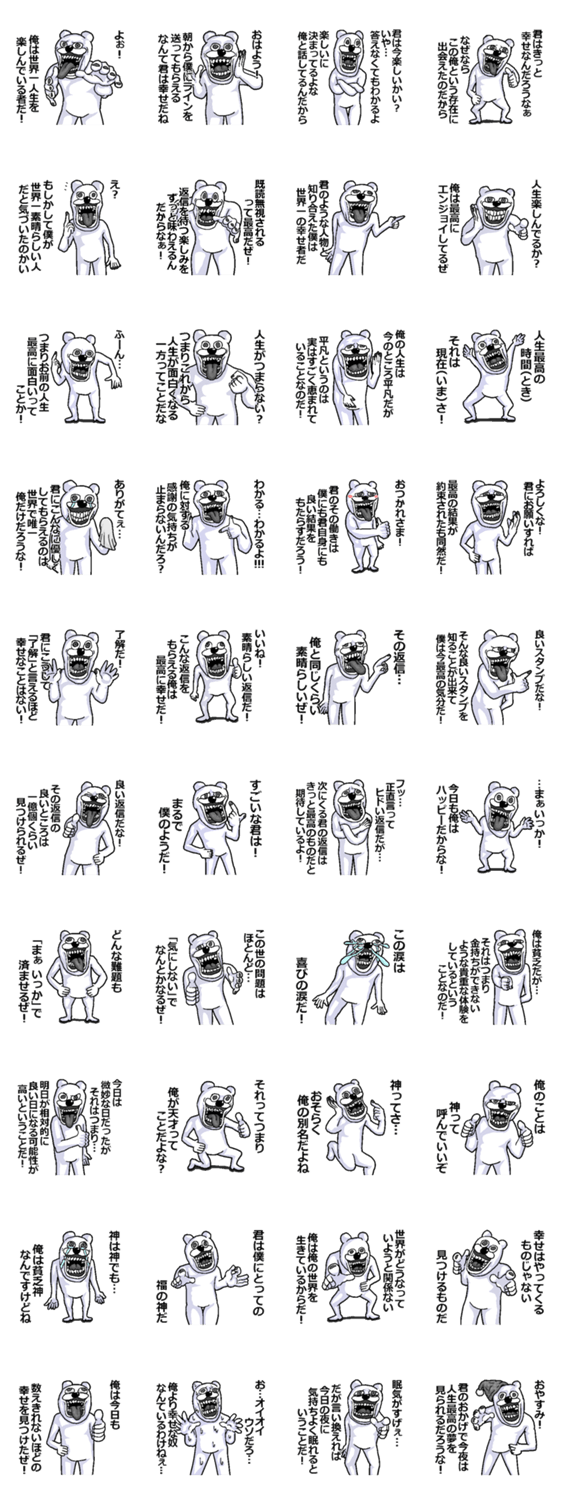 プラス思考のクマのスタンプです。何事も前向きにプラス思考でいればやり過ごせるだろう。ポジティブ。ウザい、キモい、面白い。うざくてきもい動物たちシリーズ。取扱注意