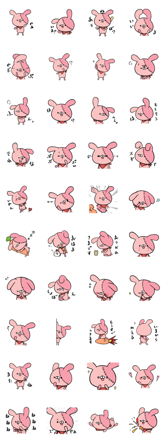 ツギハギとぺろんと出た舌がぷりちーなうさぎのぬいぐるみぺろたんの日常会話スタンプです